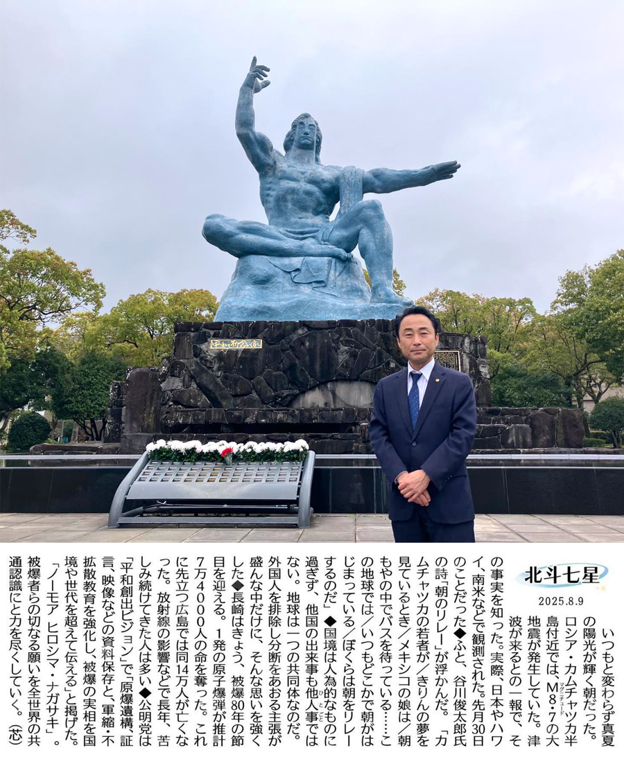 【長崎は9日、被爆80年の「原爆の日」を迎えました】 公明党は5月に「平和創出ビジョン」を発表し、核廃絶への揺るぎない姿勢を示しました。 唯一の戦争被爆国として、非核三原則を堅持し、核兵器禁止条約の署名・批准に向けた環境整備を進めていきます。 私も広島と長崎を訪問し被爆体験を伺いました。 人類の生存を脅かす核兵器は絶対悪である、との思想を全世界に広めていく決意を新たにしました。 | |