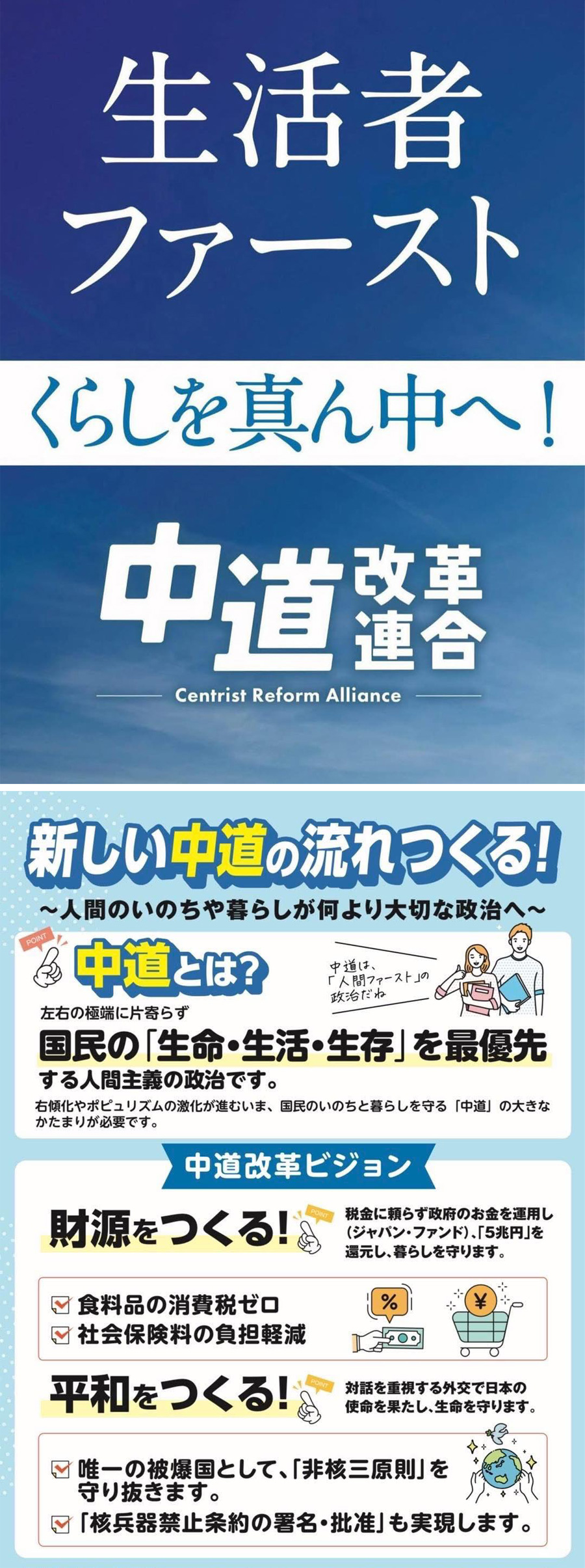 【いのちと暮らしを守る、新しい #中道 の流れを!】 いま、政治の右傾化やポピュリズムが進む中で、国民の「生命・生活・生存」を最優先する「中道」の政治が必要です。 ● 暮らしを守る政策 ・社会保険料の引き下げ → 働く世代の負担を軽減 ・食料品の消費税ゼロ → 家計を支える「新しい社会保障」 ・ジャパン・ファンド創設 → 国の資産を運用し、税金に頼らない財源づくり ● 平和を守る外交 ・「非核三原則」を守り抜く ・「核兵器禁止条約の署名・批准」を実現する | |