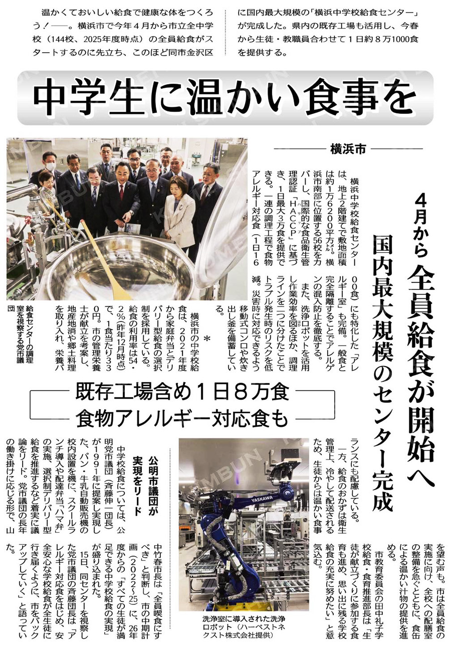 【横浜市立中学校で“全員給食”がスタート!】 今年4月から、横浜市立中学校で待望の“全員給食”が始まります。 1996年、公明党市議団として「中学校昼食」について草案を練ってから、実に30年。 長い年月をかけて積み重ねてきた取り組みが、ようやくカタチになります。 子どもたちの健やかな成長のために。 保護者の皆さまの負担軽減のために。 そして、横浜の未来をつくるために。 これからも、市民の皆さまに“結果”でお応えしてまいります! | |