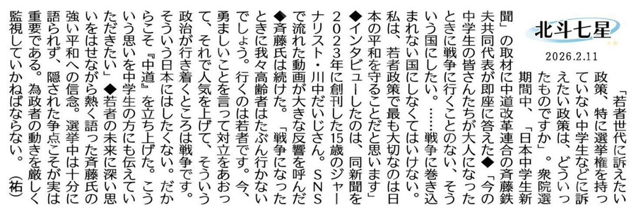 【中学生などに訴えたい政策は?】 斉藤共同代表「若者政策で最も大切なのは日本の平和を守ること」 “戦争に行かなくていい国をつくる” だから「 中道 」 その思いを若い世代へ。 静かな言葉の中に強い決意を感じます。 | |