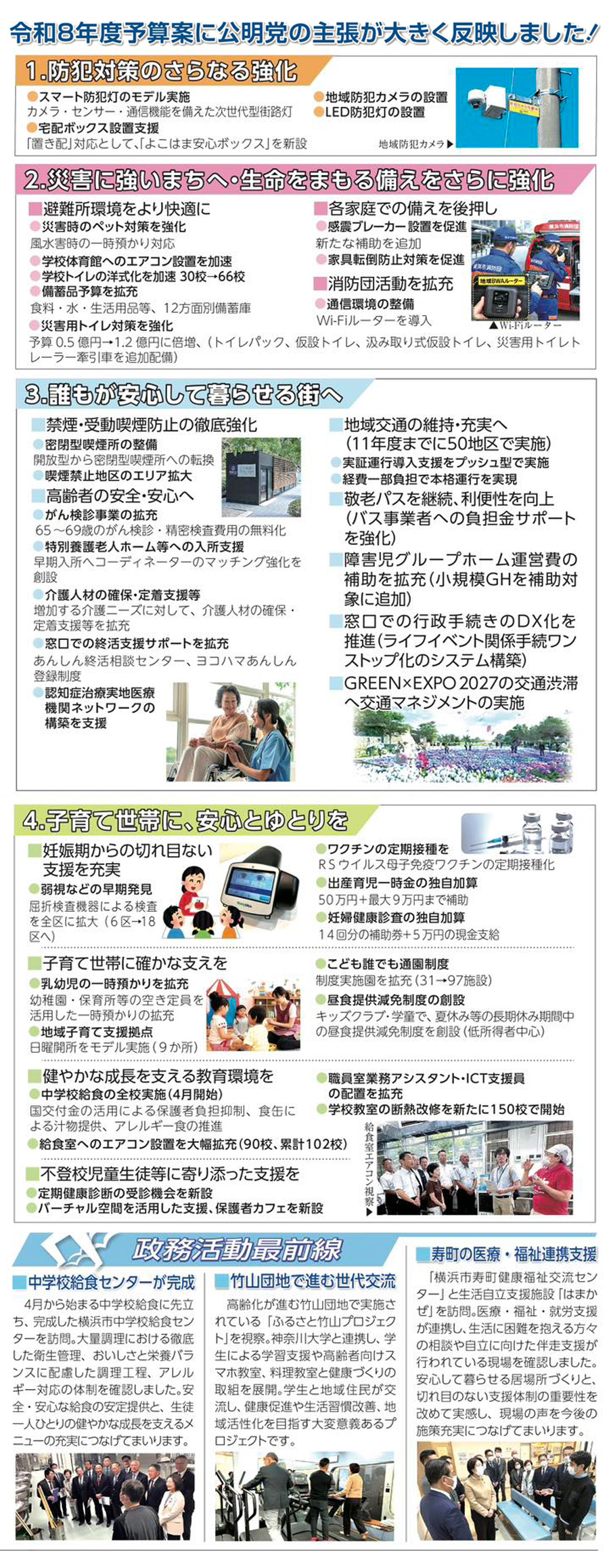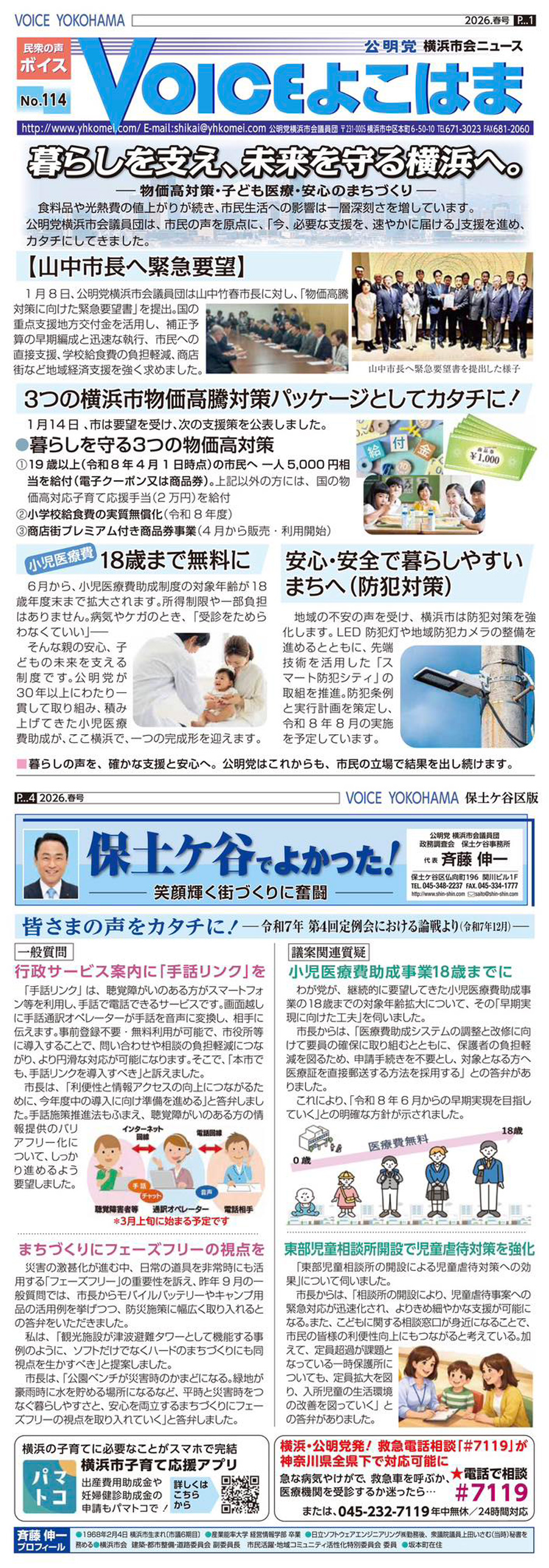 【VOICEよこはま第114号 発行①】 公明党横浜市会議員団の議会や地域における政務活動をまとめました。 暮らしを支え、未来を守る横浜へ。 これからも、皆さまの声を市政に届け、確かな結果につなげてまいります。 | |