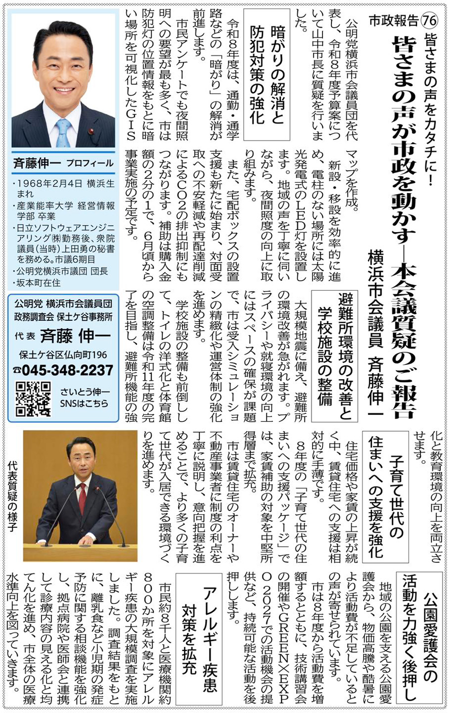 【横浜市会第1回定例会が、本日閉会しました】 1月28日から続いた審議を経て、令和8年度予算案が可決されました。 今回の予算には、公明党横浜市会議員団がこれまで積み重ねてきた提案が数多く反映されています。 市民の皆さまの安心・安全、そして暮らしを支える取り組みを前へ進めるための大切な一歩となりました。 また、「中東地域での紛争の早期事態収拾を求める決議」が全会一致で可決されました。 平和と国際社会の安定を願う横浜市会としての強い意思が示されたものです。 これからも現場の声を大切にしながら、横浜の未来に向けて、なすべきことを一つひとつ実現してまいります。 | |