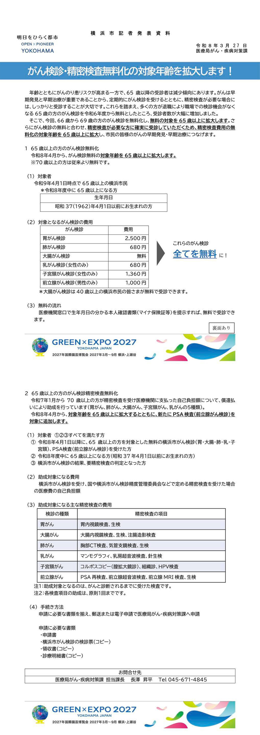 【がん検診・精密検査の無料化が拡大されます】 がんの早期発見・早期治療につなげるため、65歳以上の方を対象としたがん検診と精密検査の無料化が拡大されます。 この取り組みは、公明党横浜市会議員団としても強く推進してきたものです。 今回の拡充により、65歳以上の方の胃・肺・大腸・乳・子宮頸・前立腺がん検診が無料になります。 また、要精密検査となった場合の精密検査費用も、65歳以上の方が対象となり、新たに PSA検査(前立腺がん)も対象に追加されました。 退職などで検診機会が減る年代の受診を後押しし、市民の皆さまの健康を守る取り組みが、さらに前進します。 これからも、誰もが安心して暮らせる横浜をめざし、健康づくりの支援をしっかり進めてまいります! | |