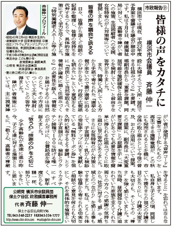 障がい者施策については、主に視覚障がい者が使用する『音声コード』(文書をコード化したもの)を再生できる携帯電話が、この秋にも発売されることを機に、市全体の取り組みとして今後の普及、および活用について提案。この提案に、副市長は「大変重要な課題」との認識を示し、「障がいがあっても必要な情報を簡単に得られる仕組みづくりに取り組む」旨の答弁がありました。